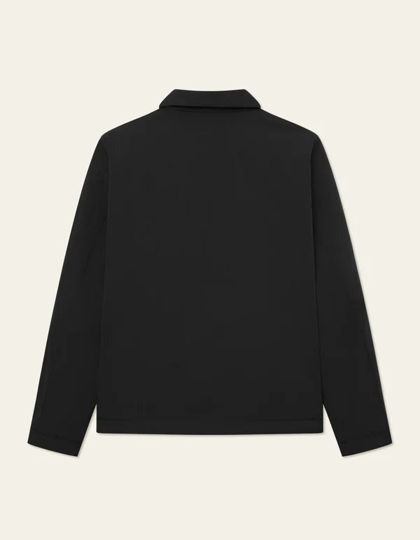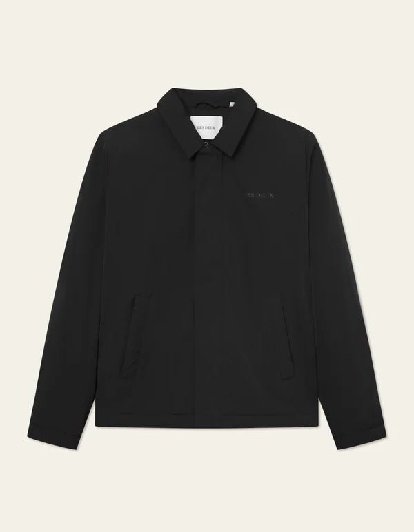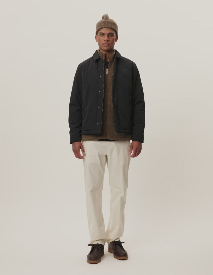 Sleek and low-profile. The Idris is a lightly padded coach-style jacket with a clean rubber logo print at the chest and simple snap button front.