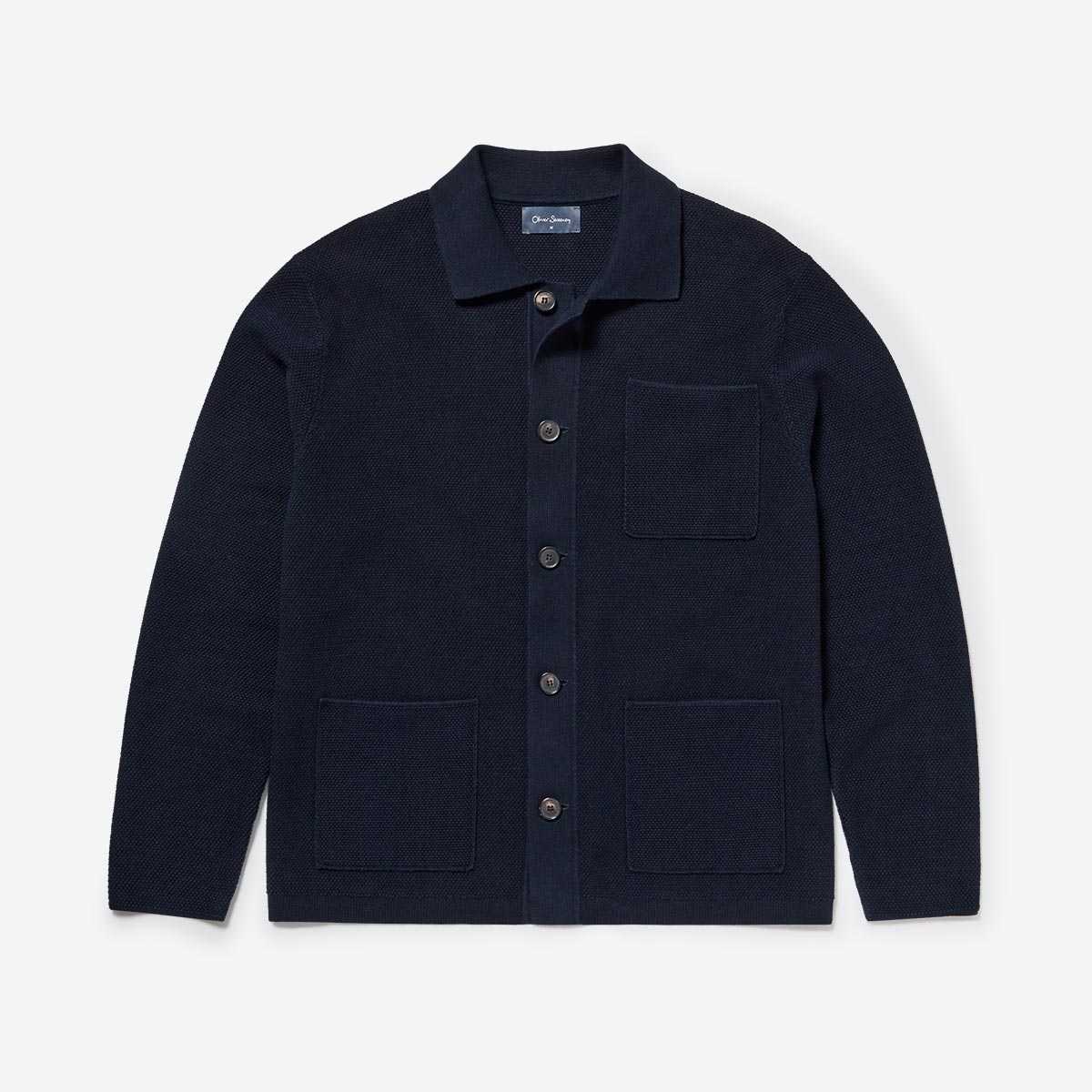 Our new navy overshirt is made from a soft 100% cotton knit in a Moss stitch, a textured knit with a ‘cross stitch’ look. The collar and placket are a sturdier flat Milano knit with five natural horn buttons and the base is finished with a more flexible rib. The three patch pockets and sleeves are all neatly finished with a rolled knitted seal.