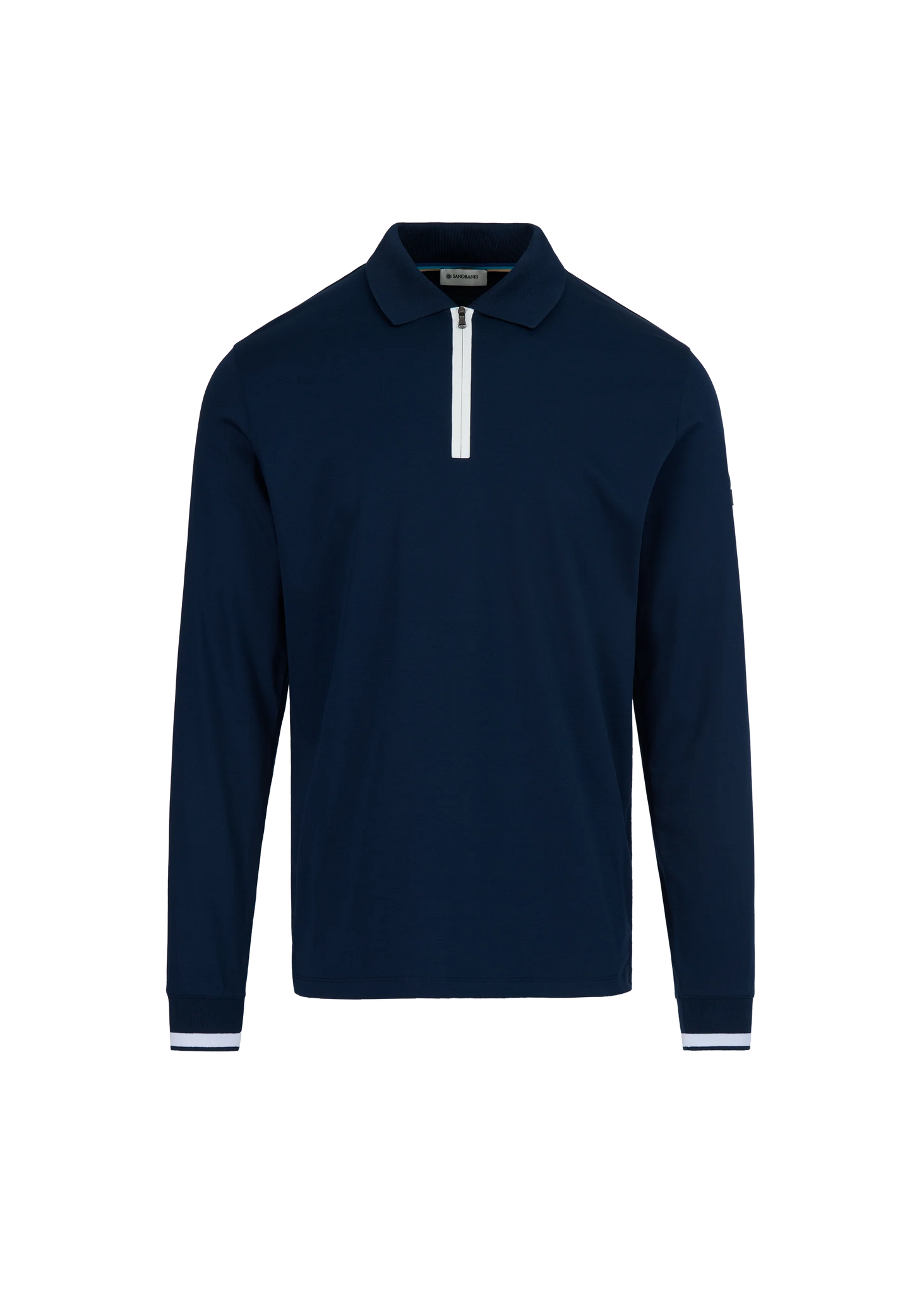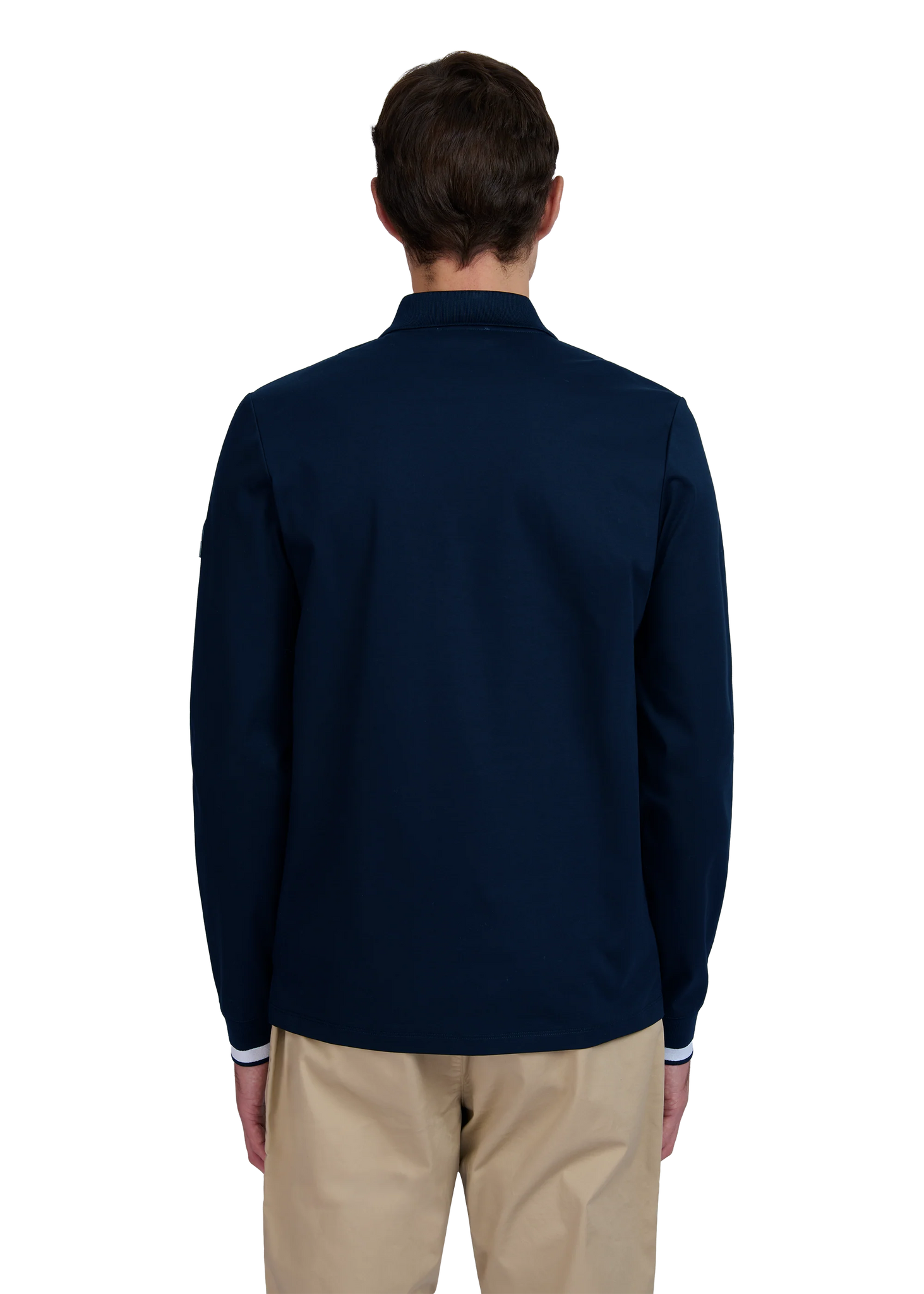 Sandbanks men's silicone zip long sleeve polo shirt in black, made from 100% mercerised interlock cotton. This slim fitting polo shirt features central Lampo silicone zip in white with print, sandbanks rubber badge on arm, white tipped knitted cuff and tri-colour back neck binding.