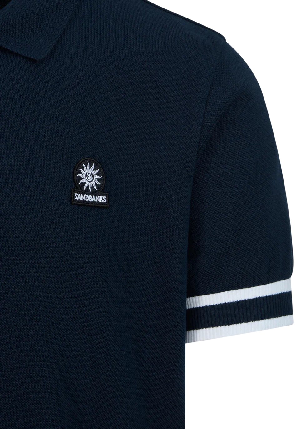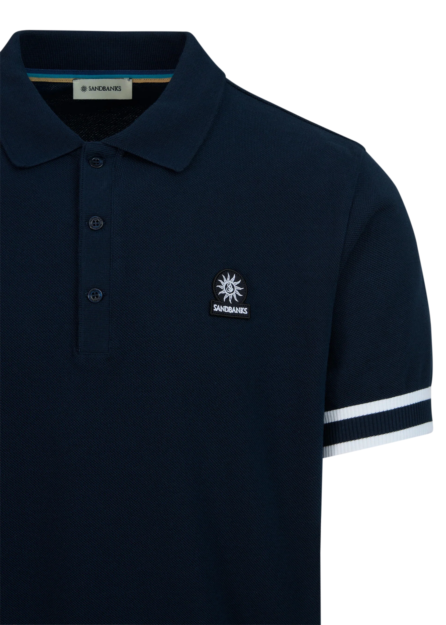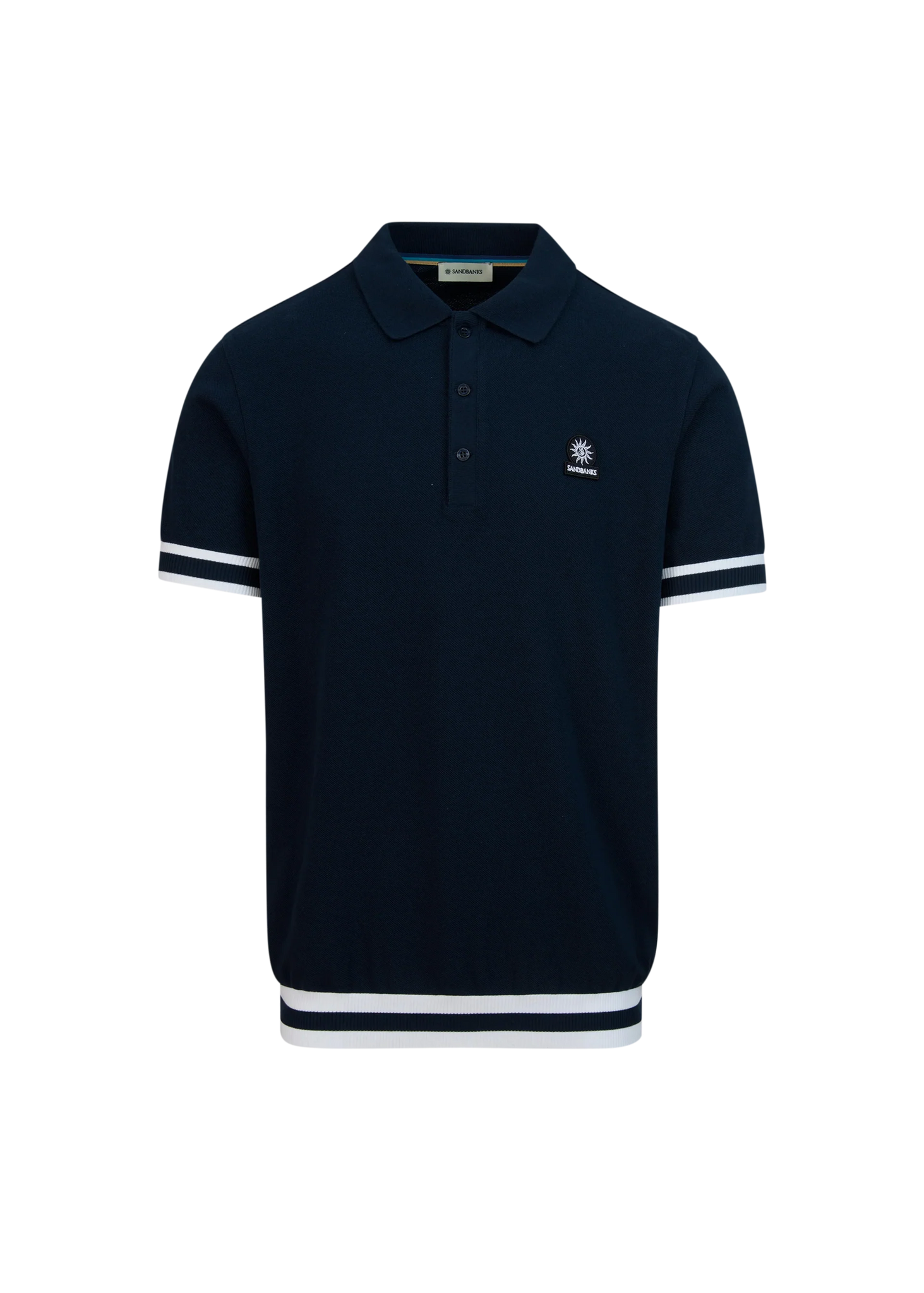 This navy Sandbanks Stripe Hem Pique Polo Shirt is a sophisticated choice, featuring a embroidered badge logo on the chest, a bold contrasting stripe rib on the cuff and waist band and statement 3 button placket with engraved pearlescent buttons.