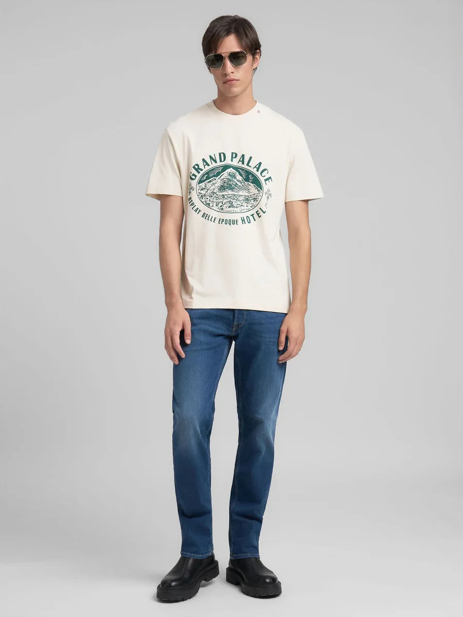 Straight-fit jeans with a regular-rise waist and a straight leg from hip to hem for a comfortable fit. This five-pocket piece comesin 10.5-oz super-stretch organic cotton dark indigo denim with a dark eco stone wash with synthetic pumice stone and a wiser wash and features hand-created whiskering and scratches. The back pockets have our iconic gull-wing stitching and one pocket bears R embroidery, while one of the front pockets features a small branded insert. Button fastening. This garment comes in organic cotton with eco washes, attesting to Replay's commitment to sustainable fashion.