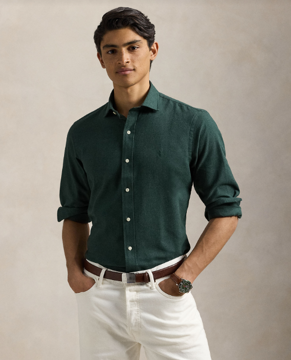 This heathered shirt is crafted from a stretchy brushed twill fabric that wicks away moisture, so you can stay cool and comfortable throughout the day.