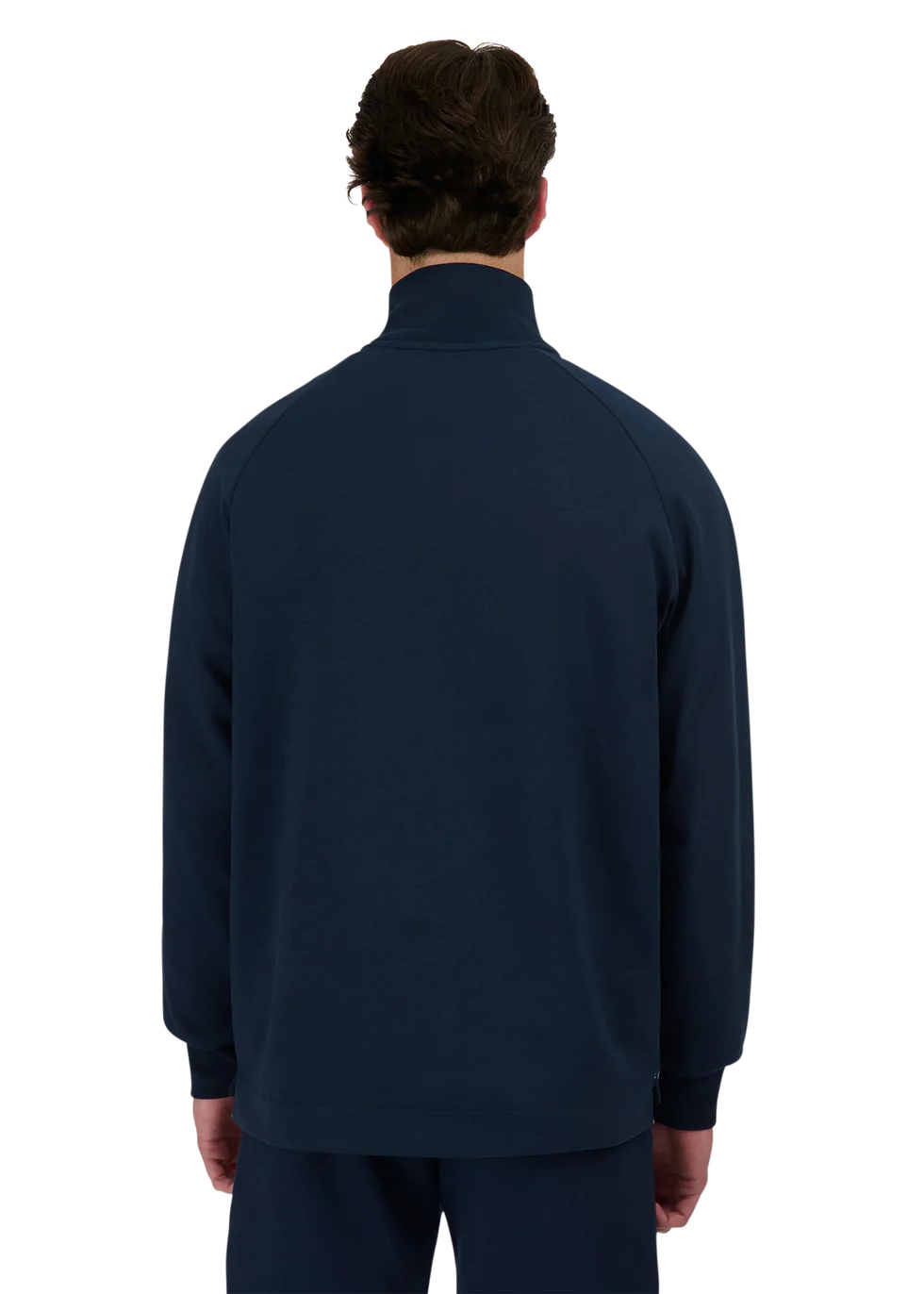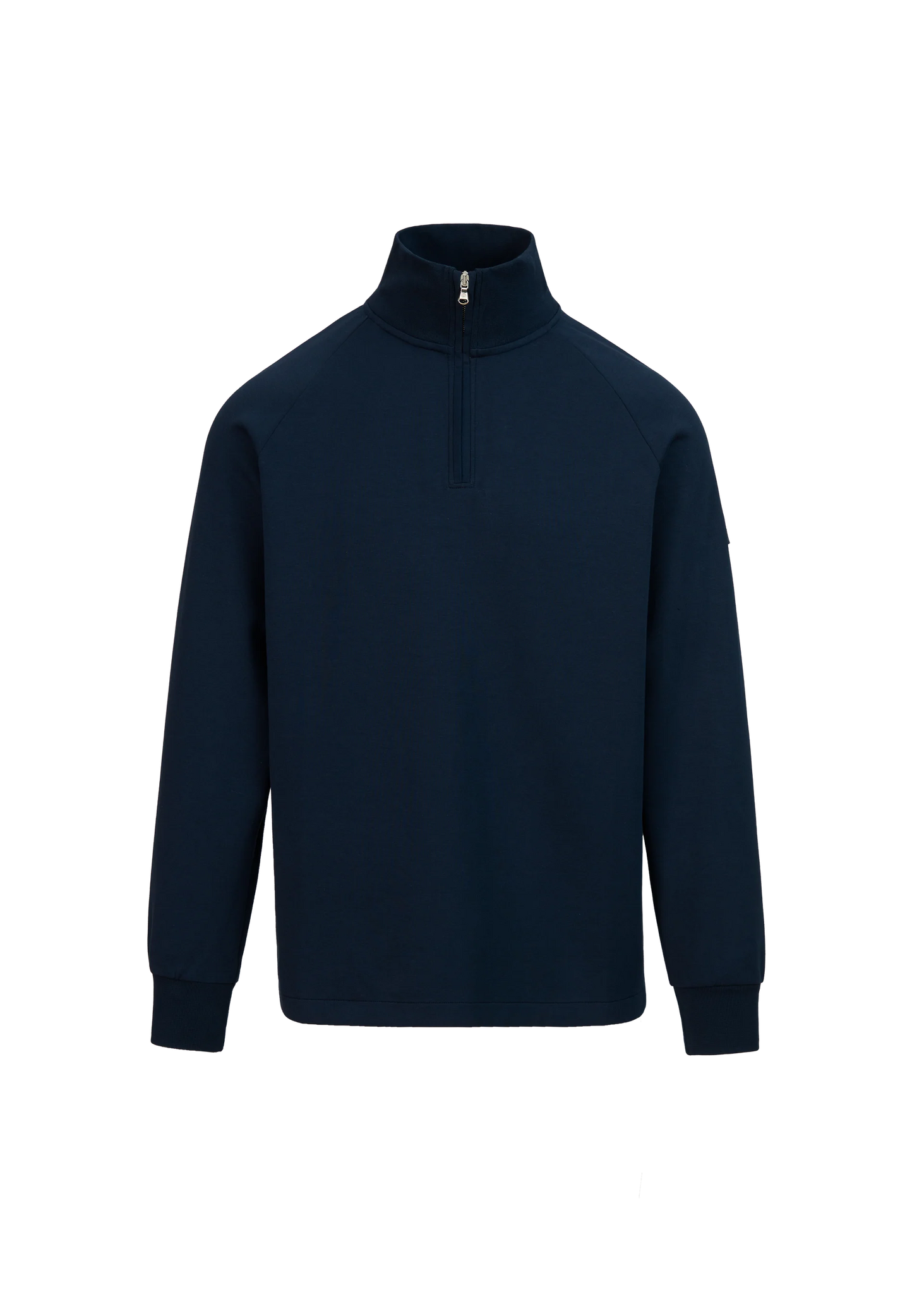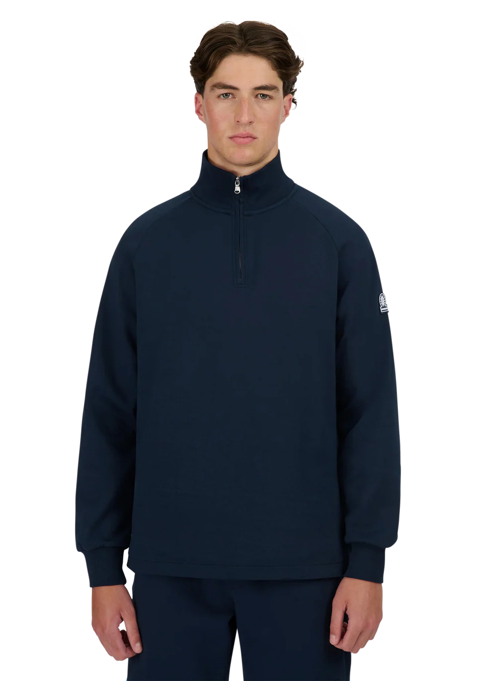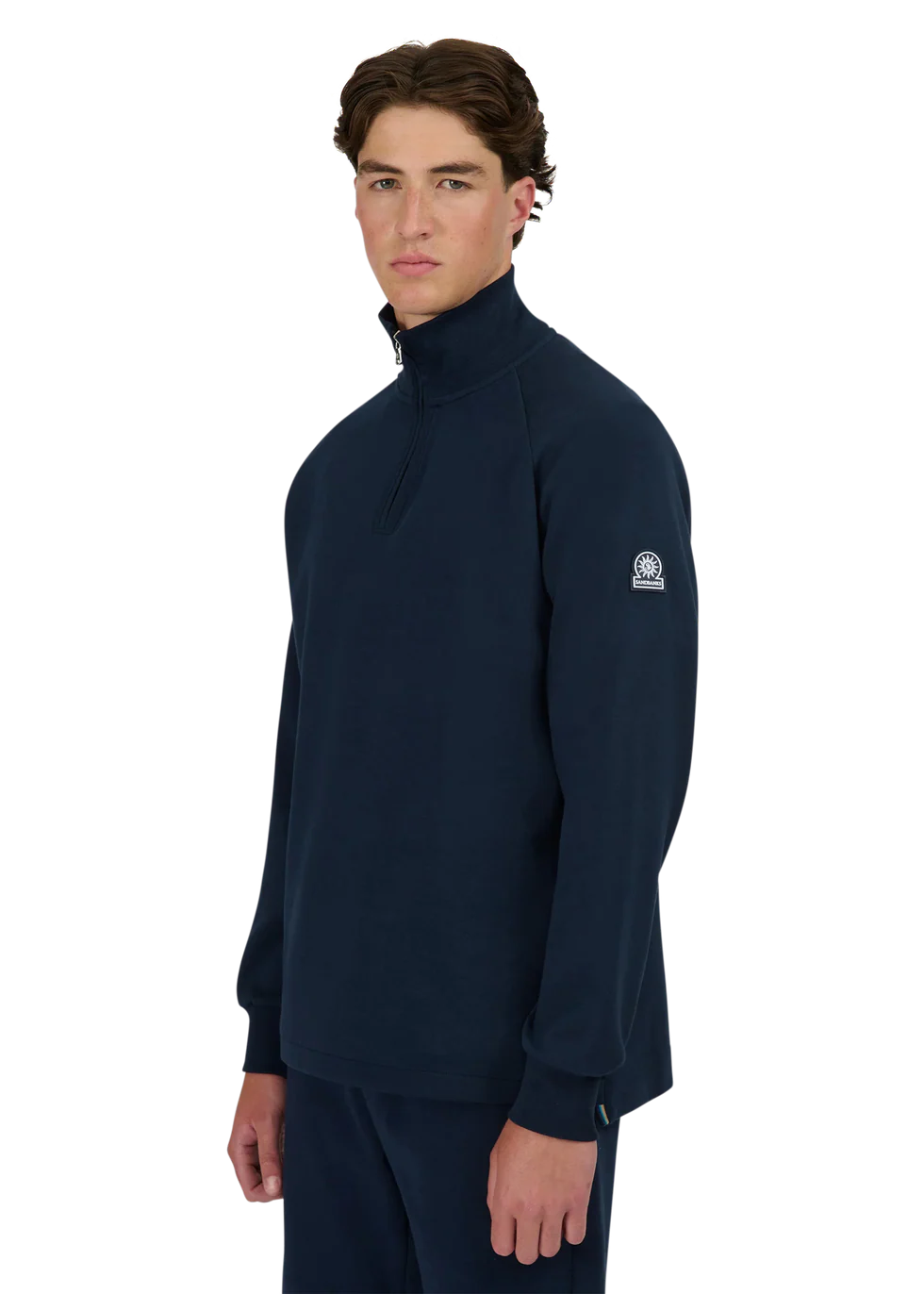 Sandbanks men's badge logo quarter zip sweatshirt in navy. This classic fitting garment is made from an interlock fabric for a superior smooth finish, featuring tonal rubber badge with contrast branding, and Lampo metal zip in silver with a ribbed neck.