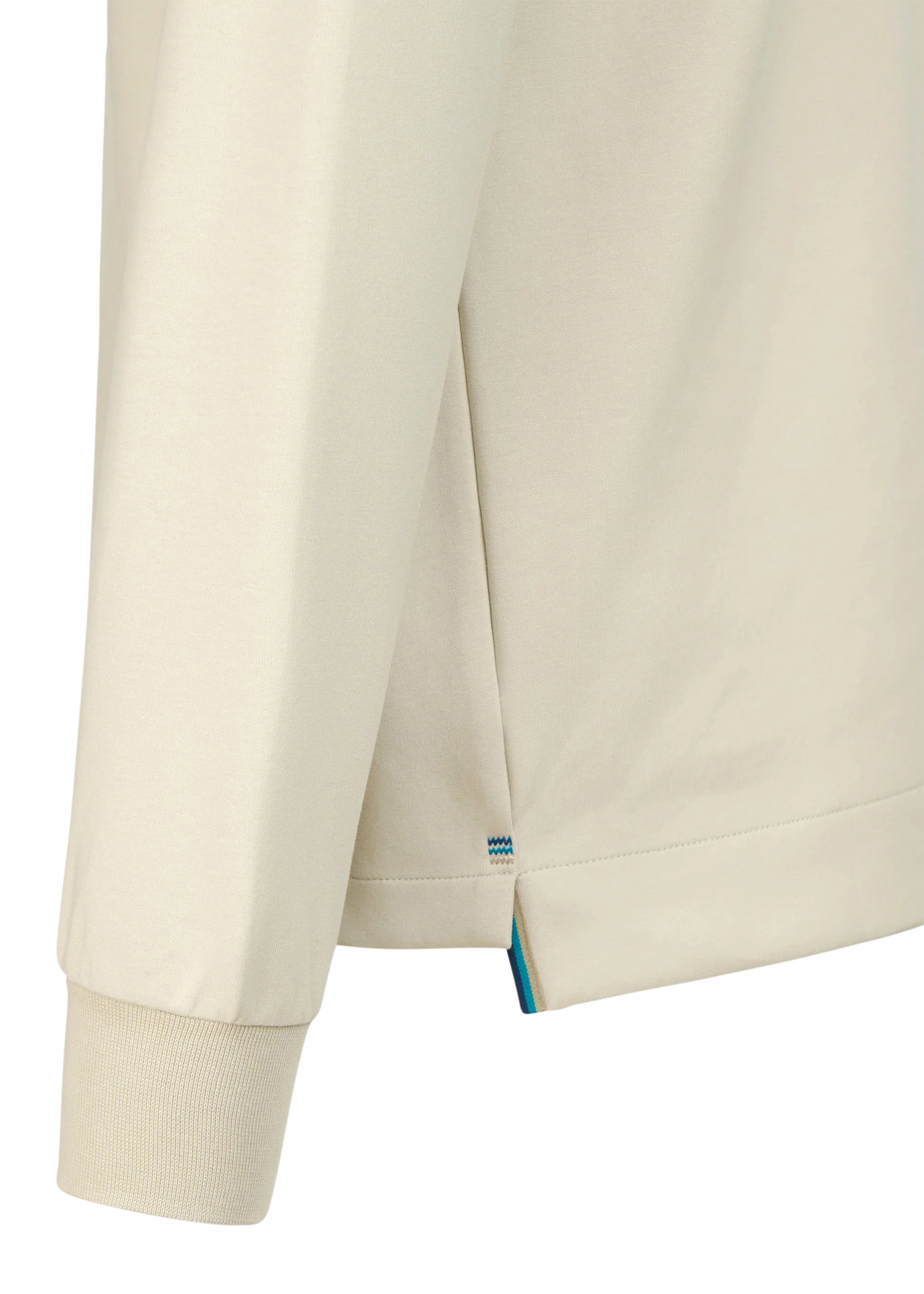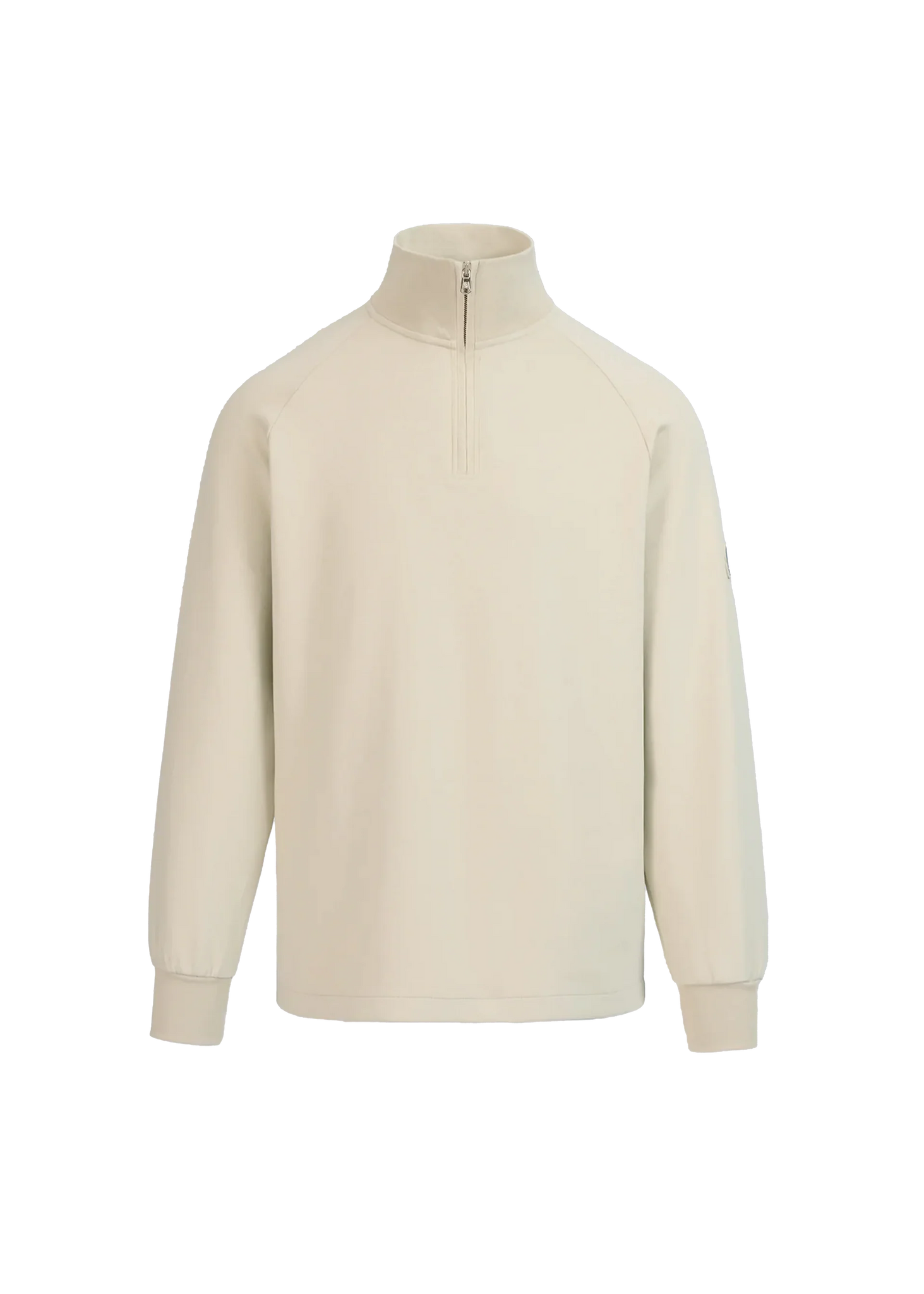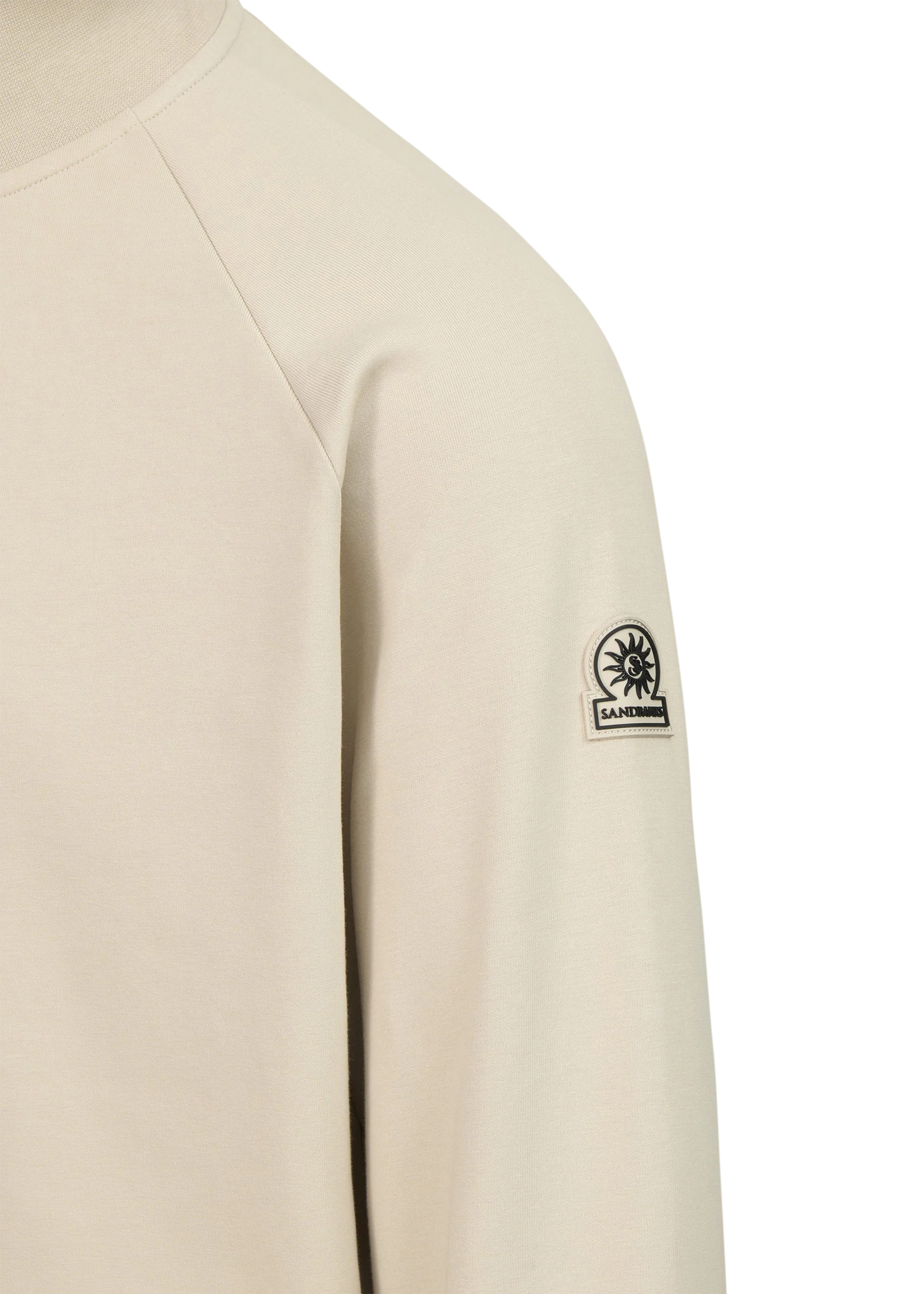 Sandbanks men's badge logo quarter zip sweatshirt in stone. This classic fitting garment is made from an interlock fabric for a superior smooth finish, featuring tonal rubber badge with contrast branding, and Lampo metal zip in silver with a ribbed neck.