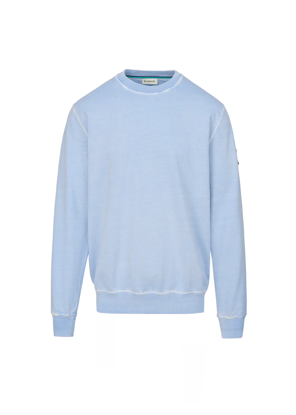 Sandbanks mineral sweatshirt in dusty blue. Designed for comfort beyond the everyday, this sweatshirt has been crafted from luxury 290 GSM BCI cotton for a soft touch. Details include a tri-colour neck binding and an embroidered garment-dyed logo badge. Each piece is dyed with a bespoke mineral wash treatment for a soft fade, creating subtle tonal variations that make each garment uniquely its own.