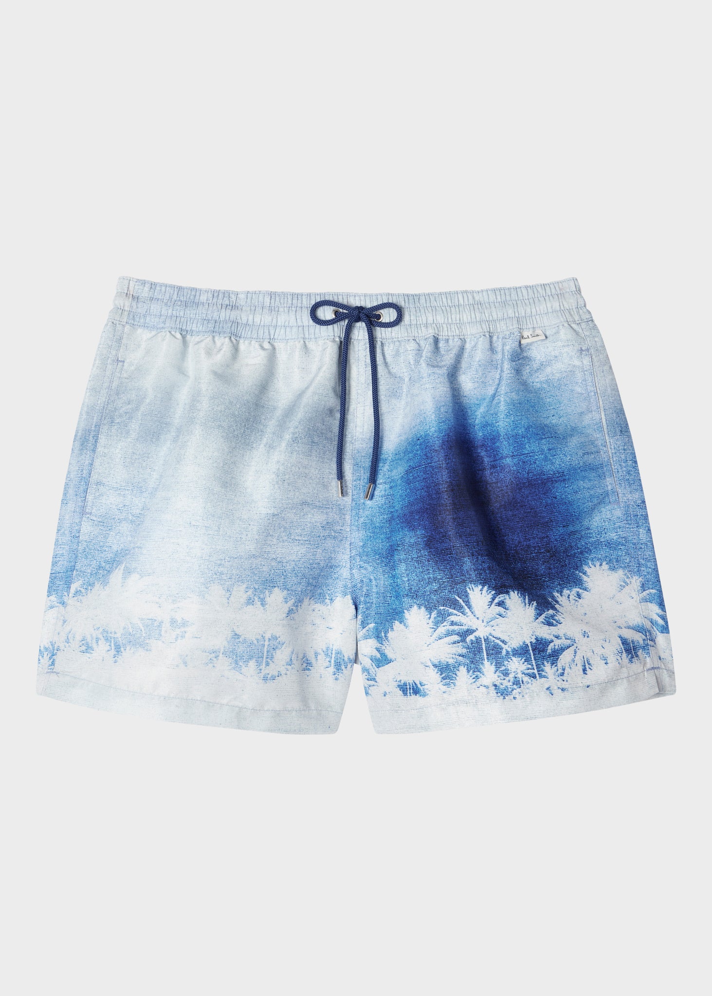 Made from 100% recycled polyester for a fast drying finish, these blue swim shorts feature a 'Palm Sunset' print. Ideal for your next warm weather getaway, or a trip to the local pool, these swim shorts are finished with a mesh lining and drawstring waistband.