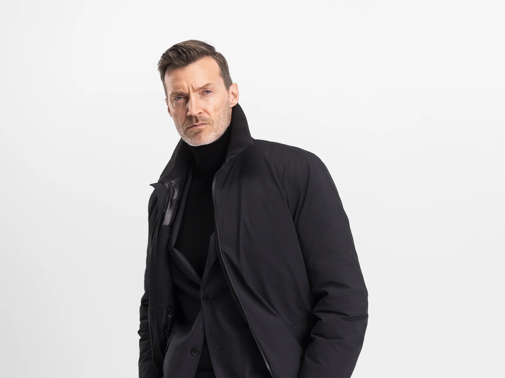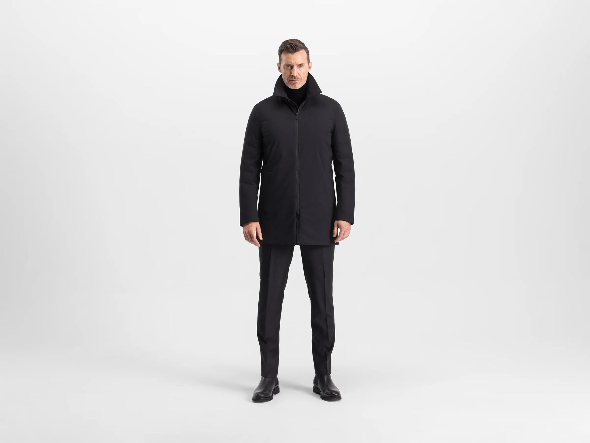 This unique quilted business coat offers a sleek, formal silhouette combined with exceptional functionality. It provides the protection of rainwear without the stiffness, and the warmth of premium goose down but without the weight and bulk. Soft, comfortable, and highly versatile, it is the ideal companion for business travel to destinations where you must be prepared for any conditions.